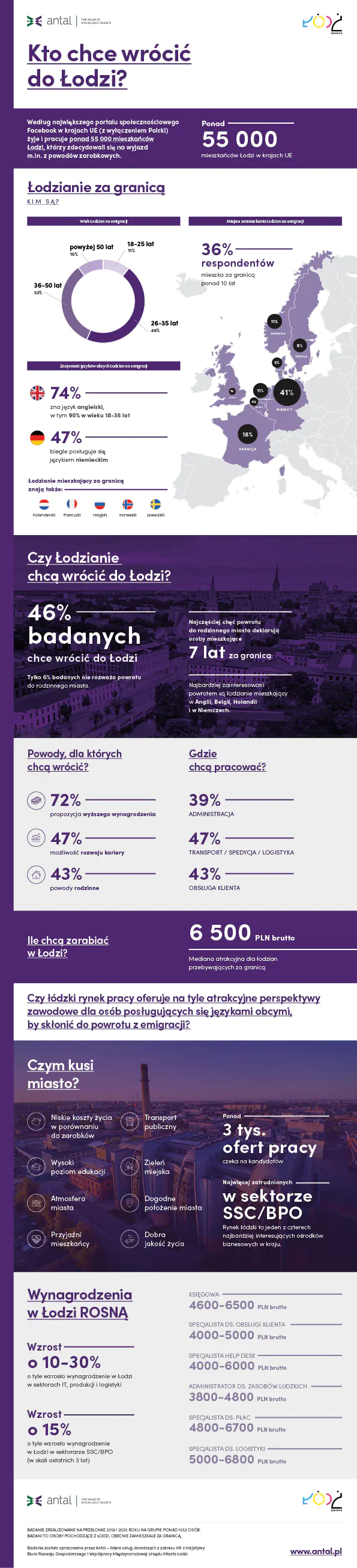 Wyniki badania przeprowadzonego przez firmę Antal na zlecenie Urzędu Miasta Łodzi wskazują, że co drugi łodzianin jest zainteresowany powrotem do rodzinnego miasta. Najczęściej wymienianym powodem zmiany miejsca zamieszkania jest propozycja atrakcyjnego wynagrodzenia oraz możliwość rozwoju zawodowego.