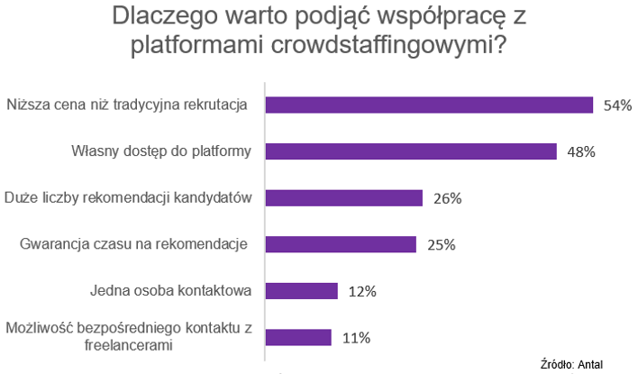 Wysoko plasuje się również oczekiwanie co do gwarancji czasu na rekomendacje (25% wskazań). W przypadku platform crowdstaffingowych rekruterzy są w stanie indywidualnie oszacować i zagwarantować czas realizacji, jednak może się to wiązać z dodatkowym kosztem. Specyfika współpracy z freelancerami powoduje, że nie ma bezpośredniej podległości i aby dać taką gwarancję, po pierwsze niezbędna jest odpowiednia skala, a po drugie znajomość swoich podwykonawców, ich specjalizacji, aktualnego obłożenia własnymi projektami i aktywne zarządzanie nimi na projektach. Niektóre platformy wprowadziły stanowiska mentorów czy opiekunów, aby oddelegować te zadania. Na przykład, na platformie ReX operacyjniee zarządzamy z poziomu Antal. Każda dywizja Antal ma ReX Leadera, który opiekuje się projektami z danej dziedziny i dba o ciągły spływ kandydatów pozostając w kontakcie z rekruterami. Dzięki temu firma jest w stanie na bieżąco oszacować czas niezbędny na realizację zlecenia rekrutacji.