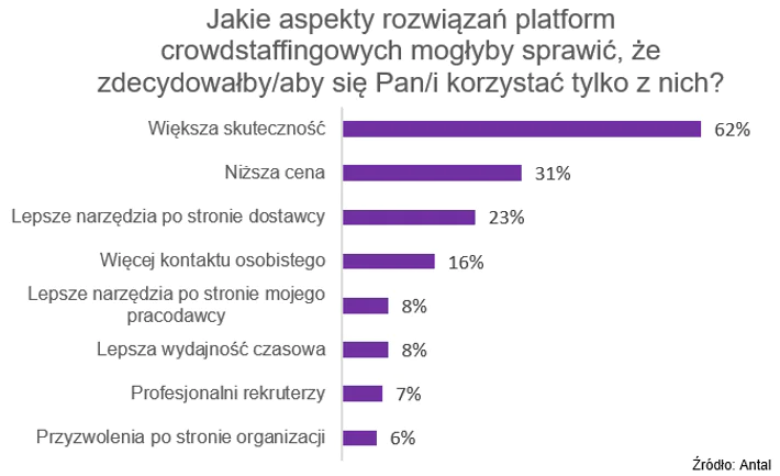 Większa skuteczność to zdecydowanie najważniejszy czynnik, który decyduje o wyborze metody crowdstaffingowej. Biorący udział w badaniu Antal „Crowdstaffing w rekrutacji” zaznaczyli, że sprawdzony przez klientów produkt, wraz z pozytywnymi opiniami przekonałby ich najbardziej, by korzystać tylko z tej opcji. Na drugim miejscu, również ważną rolę gra cena. Niskie koszty rekrutacji to coś, czego metodzie crowdstaffingowej nie brakuje, tym bardziej porównując ją z modelem rekrutacji tradycyjnej, która wymaga większych nakładów finansowych. Aby w pełni zaufać tej innowacyjnej metodzie najlepiej dać jej szansę i ocenić w praktyce, jak sprawdza się w danym przypadku.