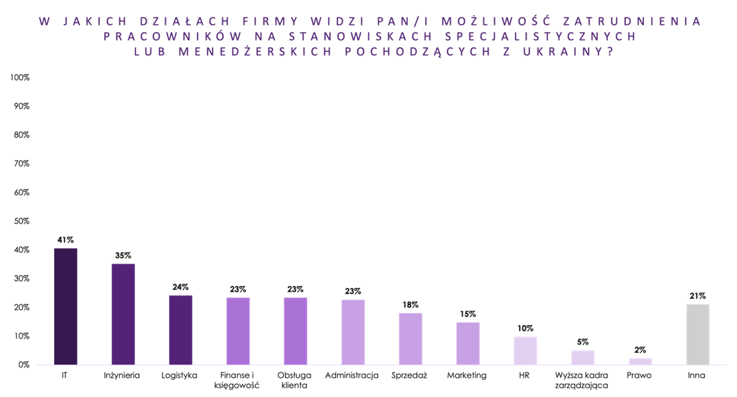77% pracodawców w badaniu przeprowadzonym przez Antal deklaruje chęć zatrudnienia pracowników z Ukrainy również na stanowiskach specjalistycznych i menedżerskich. Wakaty czekają w praktycznie wszystkich działach firm. Możliwość zatrudnienia ukraińskich pracowników według badanych przełoży się zarówno w krótko jak i długoterminowej perspektywie pozytywnie na polski rynek pracy.